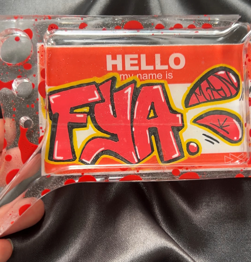 feita em transparência com pingos vermelhos e adesivo Fya Man no centro